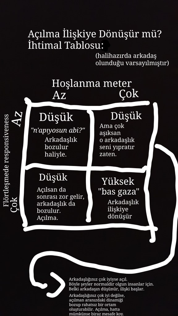 Bu tabloda iki temel faktör var: “flörtleşmedeki duyarlılık, bir başka deyişle karşıdaki sizi ne kadar görüyor, ne kadar sinyal alıyorsunuz” ve “ne kadar hoşlanıyoruz”. Tabloda gördüğümüz üzere eğer çok hoşlanıyorsak karşımızdakine açılmamız gerektiği savunuluyor. Meraklısına, arkadaşımın 4 temel açıklaması ise aşağıdaki gibi (maildeki haliyle alınmıştır):